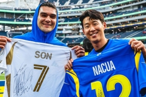 孙兴慜来到现场观看NFL比赛,并与洛杉矶公羊明星外接手纳库亚互换球衣,他在社交媒体上晒出相关照片,配文:“感谢公羊队对我的接待。”
